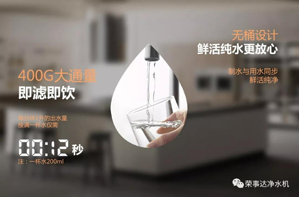 為提升用戶的“時效”體驗(yàn),榮事達(dá)400G智能反滲透凈水機(jī)從一開始產(chǎn)品定位就是400加侖出水速度,具體是什么概念呢?200ml一杯水,12秒就可以接滿,創(chuàng)新定制的400G大通量濾芯出水速度約為常規(guī)50G凈水機(jī)的8倍,隨時飲水無需等待,為生活留下更多時間欣賞窗外美景。