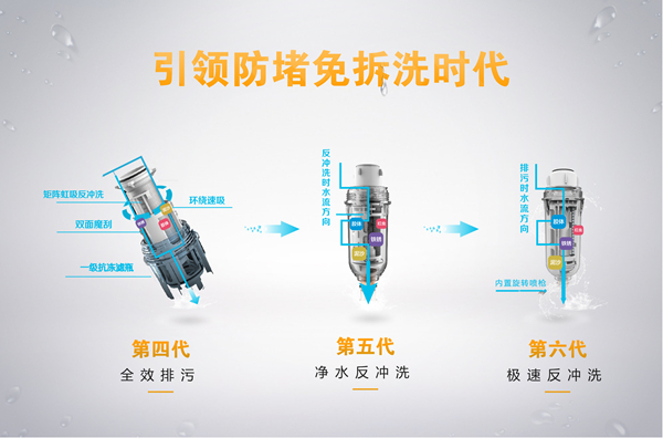 此次榮事達(dá)智能前置過濾器系列所帶來的最大不同,便是其獨(dú)有的“防堵免拆洗技術(shù)”。作為企業(yè)定向研發(fā)的專利技術(shù),有效解決了前三代傳統(tǒng)前置過濾器“易堵塞,拆洗難”的致命弊病,五款新品從第四代到第五代再到第六代,可以說是防堵免拆洗技術(shù)的梯度升級(jí)。