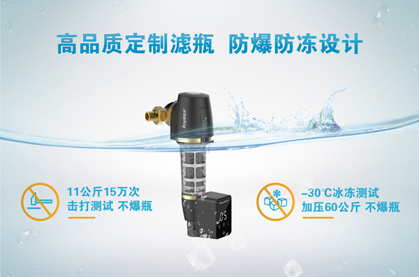 對(duì)于傳統(tǒng)前置過濾器來說一直存在一個(gè)隱患,那就是在低溫冰凍或是高壓水錘等情況下,容易引發(fā)濾瓶爆裂,令許多用戶頭疼不已。其實(shí),回歸根本來說,還是因?yàn)闉V瓶材質(zhì)不佳。榮事達(dá)為攻克這一難題,可謂是下足功夫。智能前置過濾器濾瓶采用獨(dú)特配方和原裝進(jìn)口材料,不含雙酚A,濾瓶無(wú)注塑點(diǎn),并通過NSF、SGS檢測(cè),經(jīng)過改性配方與防爆防凍極限抗壓測(cè)試,11公斤15萬(wàn)次擊打不爆瓶,-30℃冰凍測(cè)試加壓60公斤不爆瓶,濾瓶綜合性能有著質(zhì)的飛躍,保證用戶使用安心。