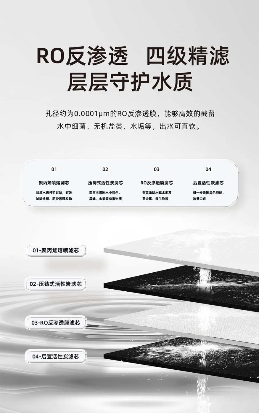 好凈水機的核心是“濾得干凈,用得省心”。新品四級精濾系統(tǒng)為自來水設四道關卡:第一道聚丙烯熔噴濾芯篩除鐵銹、泥沙,讓水變清;第二道壓鑄式活性炭吸附怪味和余氯,告別燒水異味;第三道RO反滲透膜(0.0001μm孔徑)攔截重金屬、微生物、水垢,過濾后可直飲且清甜;最后后置活性炭調口感,讓泡茶更香、煲湯更入味。
