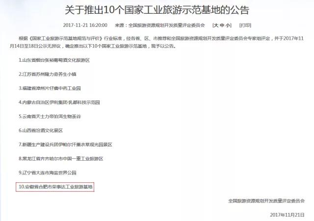 - 11月21日,全國(guó)旅游資源規(guī)劃開(kāi)發(fā)質(zhì)量評(píng)定委員會(huì)發(fā)布公告,公布10個(gè)國(guó)家工業(yè)旅游示范基地,安徽省合肥市榮事達(dá)工業(yè)旅游基地成為安徽省唯一入選單位。