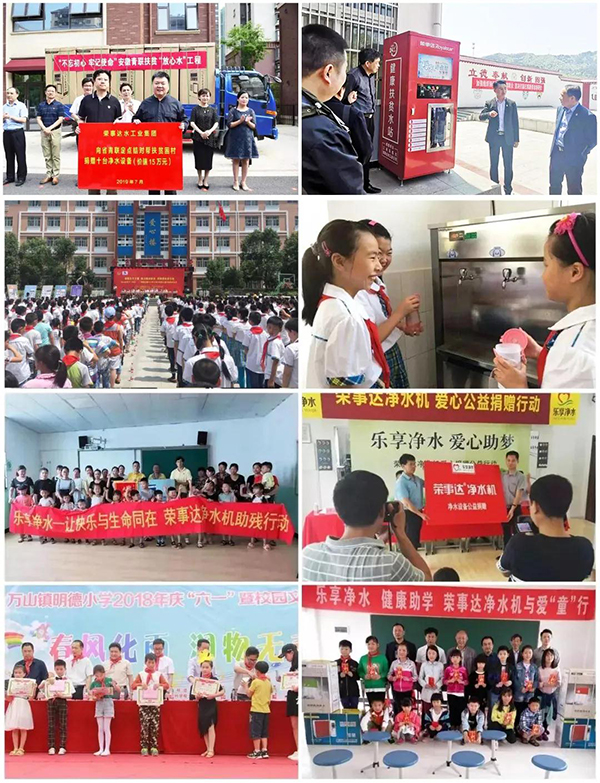 榮事達水工業從事凈水行業十余年,始終堅守企業發展與公益事業同趨共行。榮事達自2010年發起“樂享凈水”公益行動,在全國范圍內開展“健康助學”、“愛心助殘”、“愛心敬老”等各類公益幫扶,捐贈、安裝凈水設備數千套;向全國首個希望小學——金寨希望小學捐贈直飲水設備,并聯合金寨希望公益服務中心及地方公益協會共同發起“給山區孩子一杯水”——援建金寨中小學凈水設備公益活動,向金寨縣全縣中小學援建直飲水設備400多套,該項目也被評為“安徽省十佳學雷鋒志愿服務項目優秀典型”;攜手中華少年兒童慈善救助基金會發起成立“健康飲水專項基金”,開展各類校園飲水健康保障工作;攜手安徽團省委、省青聯啟動“青力扶貧聯創夢想”健康扶貧“放心水”工程,向安徽地區多個貧困村捐贈凈水設備,建立健康扶貧水站等。