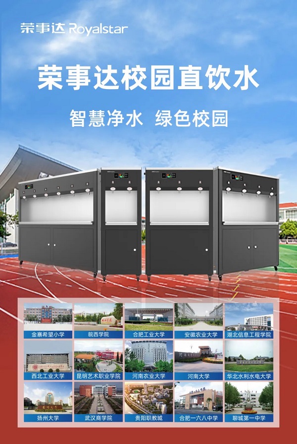 榮事達水工業(yè)先后承建了中國科學技術大學、河南大學、武漢商學院、江蘇省丹陽市第五中學等3500多所學校的直飲水工程,‘喝’護千萬師生飲水健康。