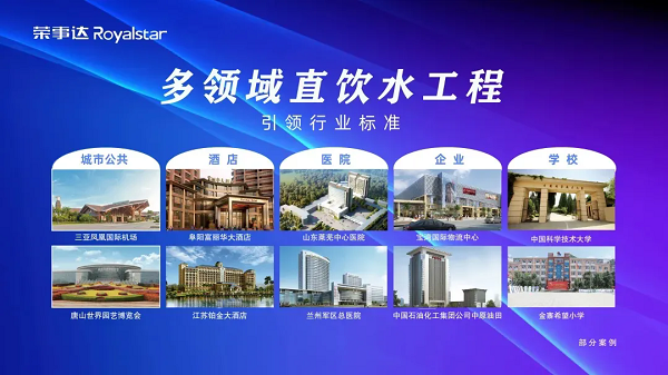 03 榮事達多領域直飲水工程 榮事達水工業公司作為凈水領域的佼佼者,已經擁有二十年的行業積累。其產品覆蓋有千萬家庭、2000+企事業單位、3500+校園等場所。此外,榮事達水工業公司還獨立設計施工大型直飲水工程,包括秦始皇兵馬俑博物館、唐山世界園藝博覽會、三亞鳳凰國際機場、合福高鐵沿途站點等知名項目,以及埃塞俄比亞總統府、馬來西亞巴生港、贊比亞恩多拉機場、巴基斯坦默蒂亞里等海外項目,贏得了廣泛的贊譽和信賴。