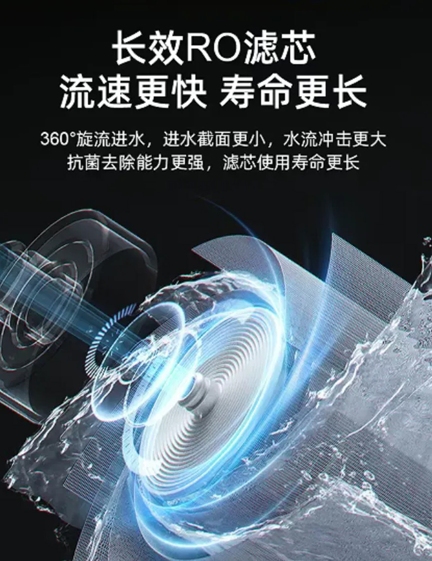 核心采用3芯5級過濾、RO反滲透技術(shù),強力濾除重金屬、細菌等有害物質(zhì)。同時,其 360° 旋流進水設(shè)計,可實現(xiàn)更快流速,延長使用壽命,且抗菌去除能力更強。貼心升級大孔徑出水龍頭,接滿一杯僅需數(shù)秒,告別涓涓細流的漫長等待。