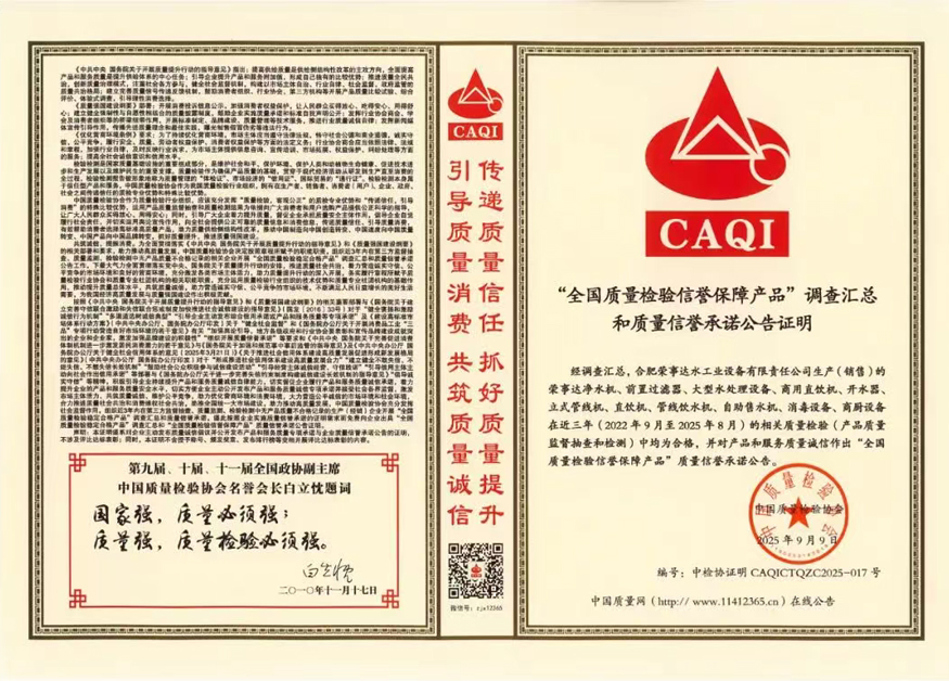 加強質量支撐,共建質量強國。在由中國質量檢驗協會牽頭組織的2025年全國“質量月”企業質量誠信倡議專題活動中,榮事達水工業公司憑借長期以來對產品品質的嚴苛堅守與積極正向的社會形象,成功通過協會多維度審核與專家團專業評定,最終一舉斬獲“全國凈水行業質量領先品牌”“全國質量誠信先進企業”“全國質量檢驗信譽保障產品”“全國質量檢驗穩定合格產品”“全國消費者質量信譽保障產品”五項榮譽。
