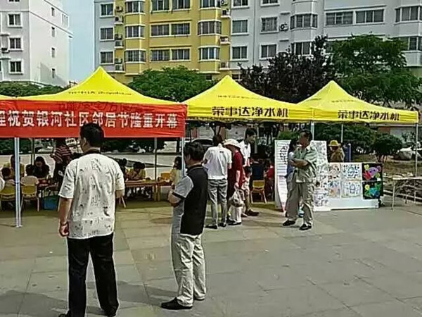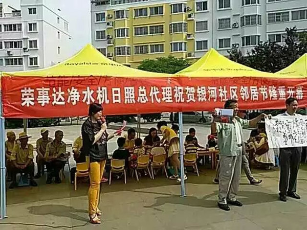 據悉,為了居民們在炎熱的夏日感受到一絲清涼,榮事達凈水機山東日照代理商和公司工作人員為居民們現場搭建帳篷,并且將凈水機搬到了活動現場,方便大家在參加活動的時候喝到免費安全的健康水。現制現飲的純凈水受到了居民們的一致好評。